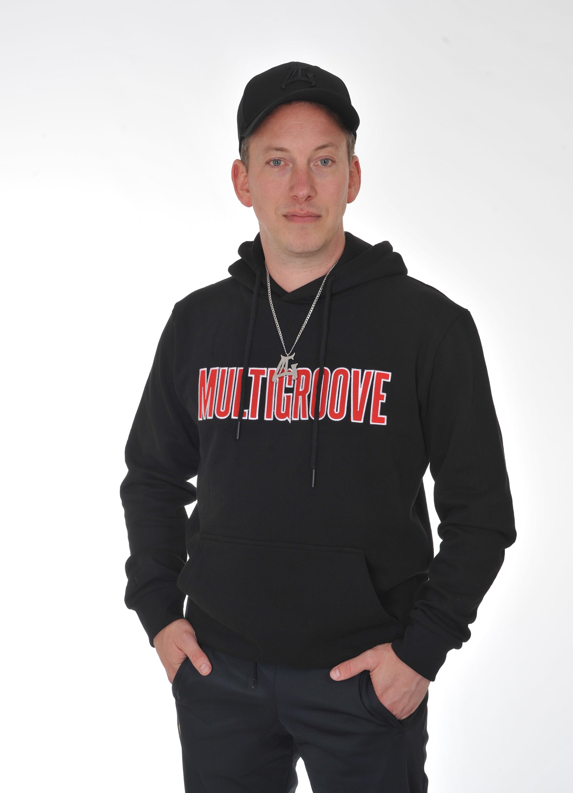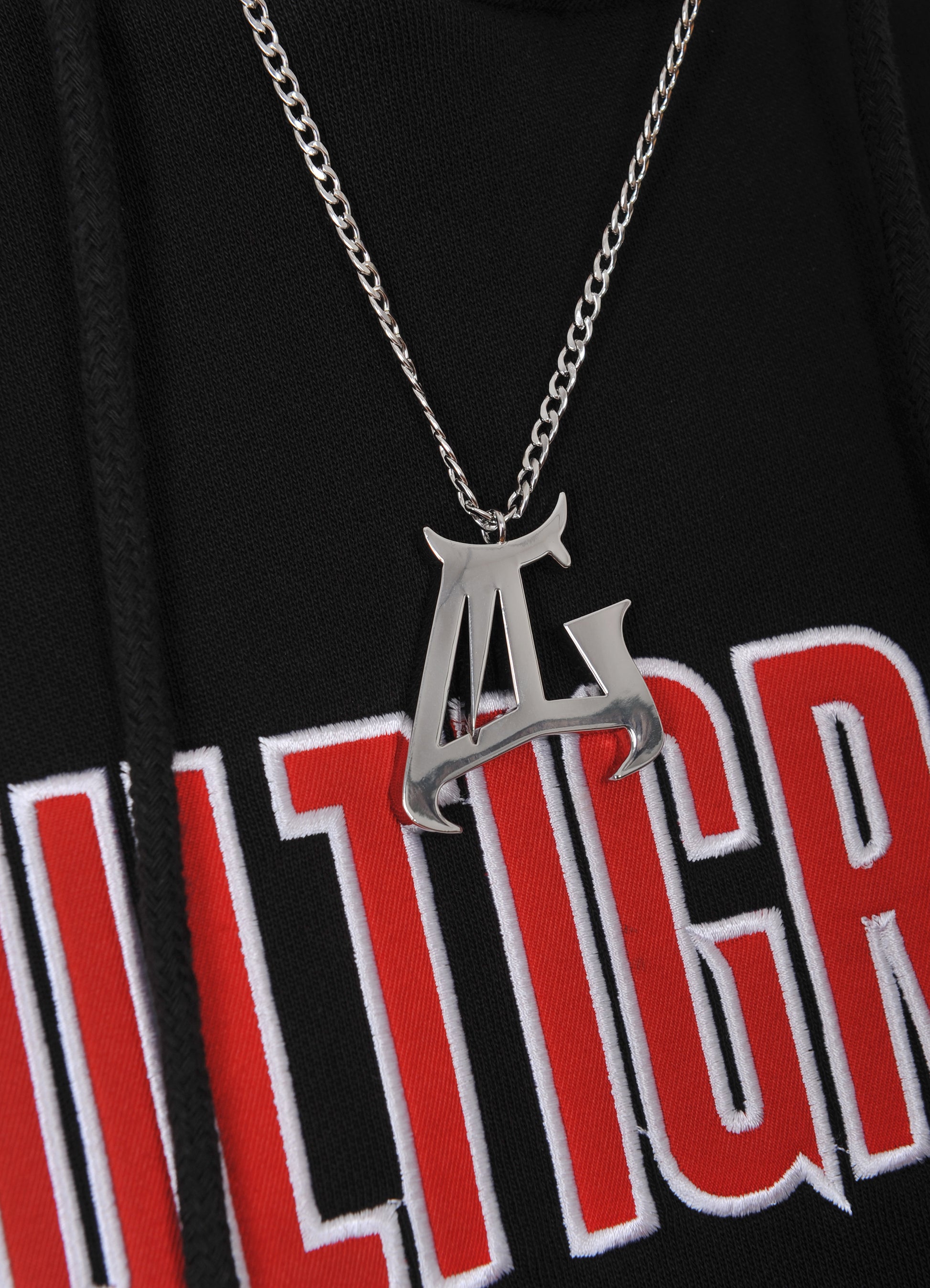 Zilverkleurige roestvrijstalen ketting met Multigroove-logo aan een dikke schakelketting.